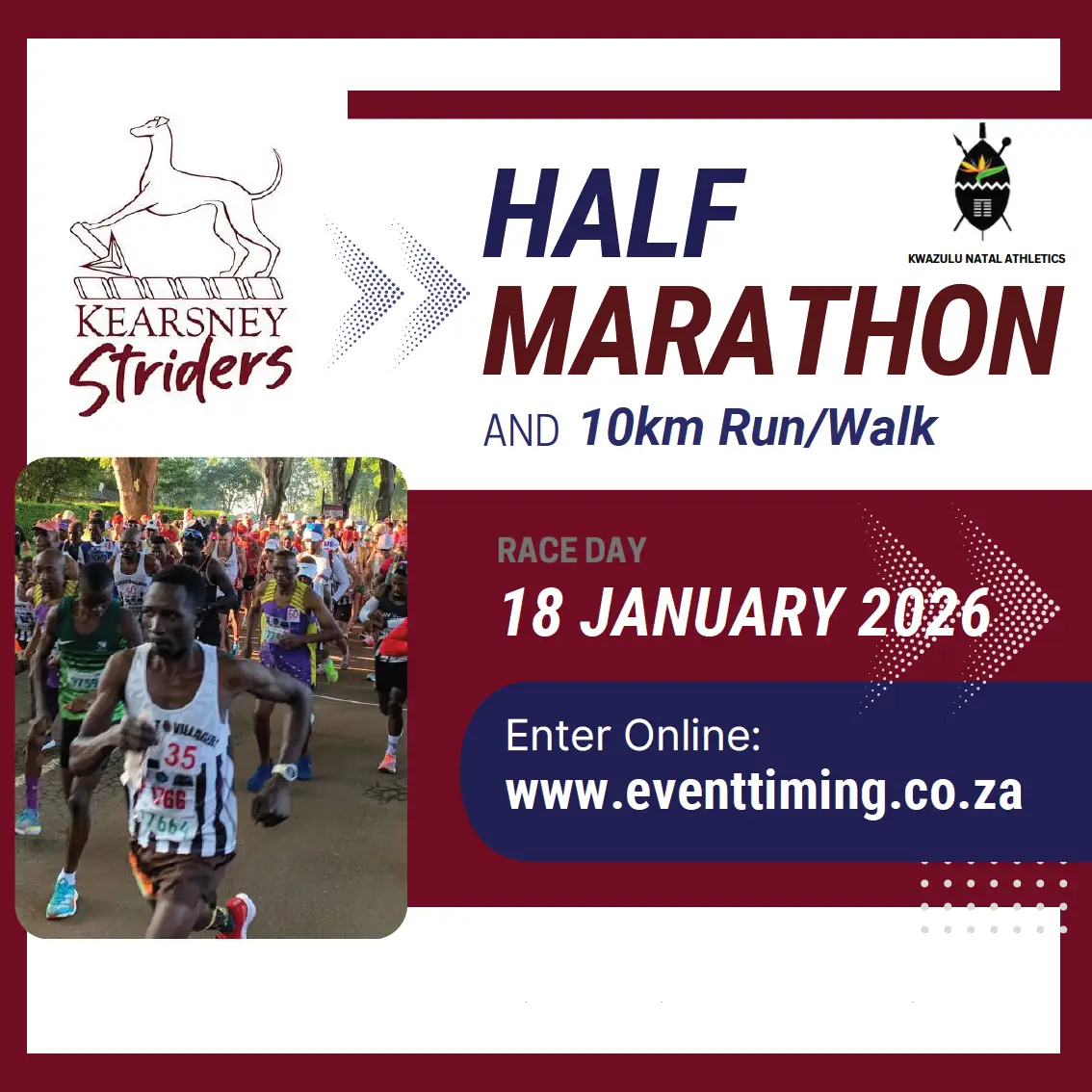 The 2026 25th Kearsney Striders Half-Marathon will take place Sunday, 18 January 2026 from 06h00 at the Kearsney College, Old Main Road, Botha’s Hill in Durban, KwaZulu Natal. Distances available include 21.1km, 10km and 10km races.
