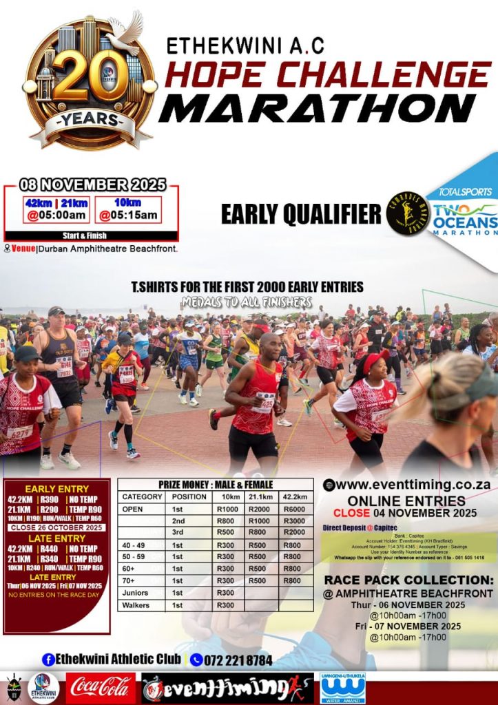 Get ready to rise to the challenge! Join us for the 2025 Hope Challenge, taking place at the iconic Amphitheatre, Durban Promenade in Durban, KwaZulu Natal. Choose your pace with our three exciting distance options: 42.2km, 21.1km, and 10km races.