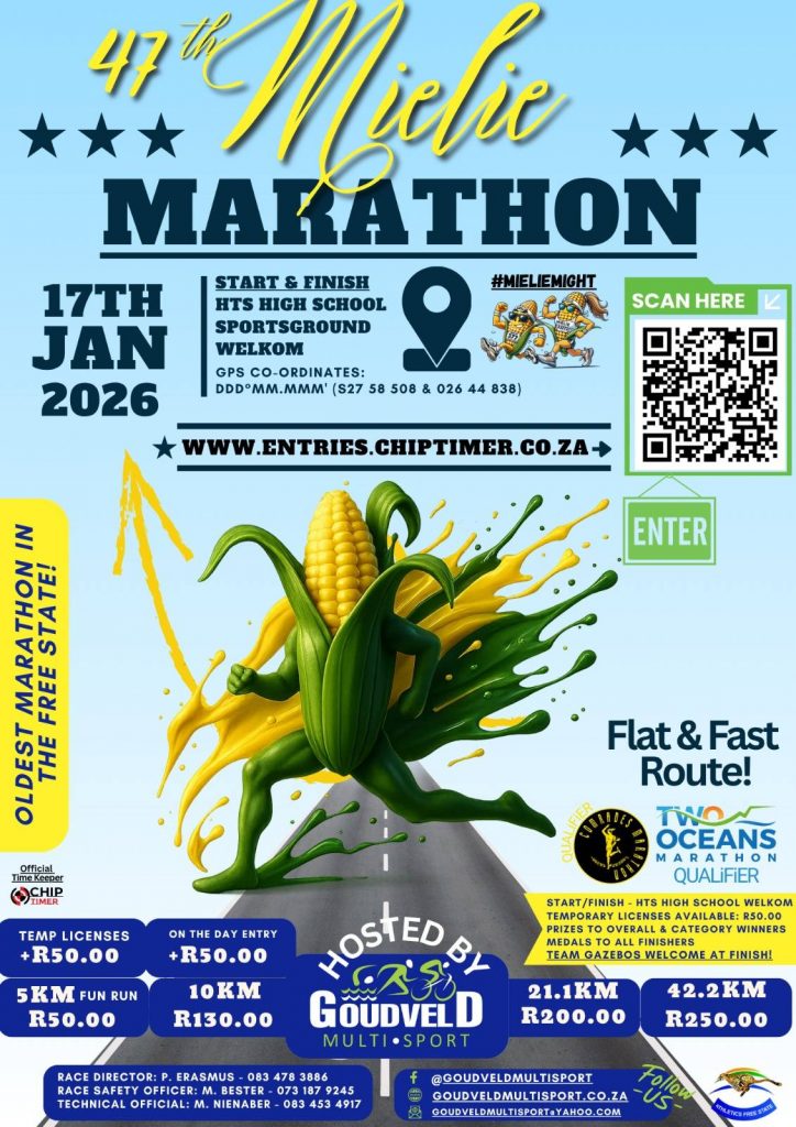 Kick off your running season at the Mielie Marathon, starting at 05h30 from the HTS High School Sportsground in Welkom, Free State.