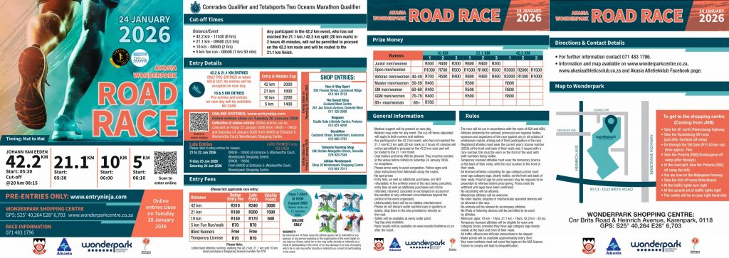 The 2026 Wonderpark Akasia Road Race will take place Saturday, 24 January 2026 from 05h30 at the Wonderpark Shopping Mall in Pretoria, Gauteng. Distances available include 42.2km, 21.1km, 10km and 5km races.
