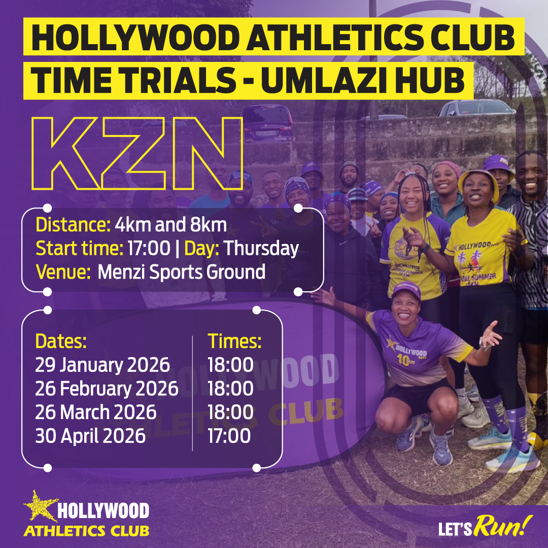 Hollywood Athletics Club – Mlazi HUB time trials are maximum-effort runs over a set distance to assess fitness and pacing. While runners may aim for personal bests, the session can also be used as a controlled training run. Open to the running community, time trials are an effective way to track progress and build overall fitness